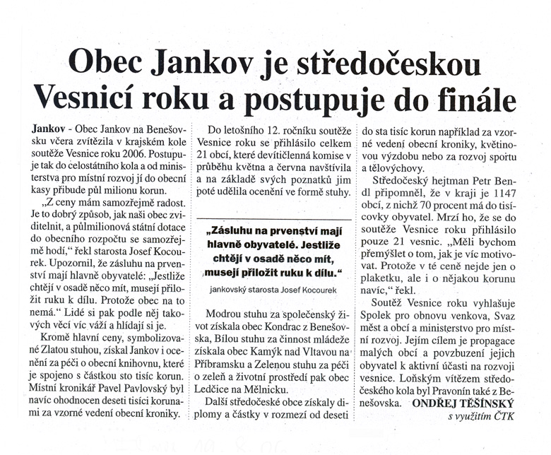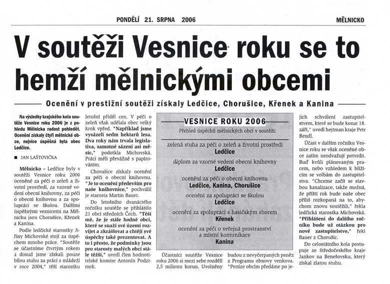 Dne 17.8.2006 v Jankově při vyhlášení výsledků soutěže Vesnice roku 2006 za Středočeský kraj, převzala starostka Jiřina Michovská pro obec Ledčice tato ocenění: Zelenou stuhu za péči o životní prostředí a zeleň, Ocenění za péči o obecní knihovnu a Ocenění za spolupráci se školou. Obec tímto získala do svého rozpočtu 500 000,-Kč. Mladá fronta dnes 19.8.2006 Deník Bohemia 21.8.2006
