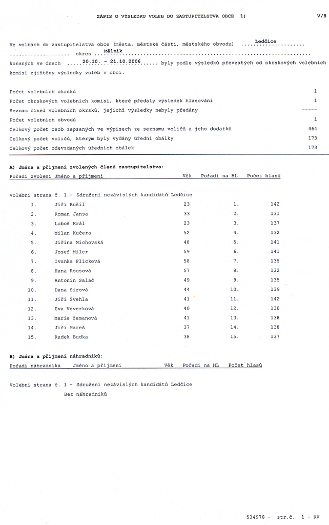 Svým podpisem stvrdili : Jiřina Michovská, Milan Kučera, Ivanka Plicková, Josef Miler, Roman Jansa, Antonín Salač, Marie Zemanová, Jiří Mareš, Hana Rousová, Jiří Švehla, Eva Veverková , Jiří Bušil, Luboš Král, Dana Sirová a Radek Budka, že budou ve volebním období 2006-2010 svou funkci vykonávat čestně a zodpovědně v zájmu ledčických občanů.