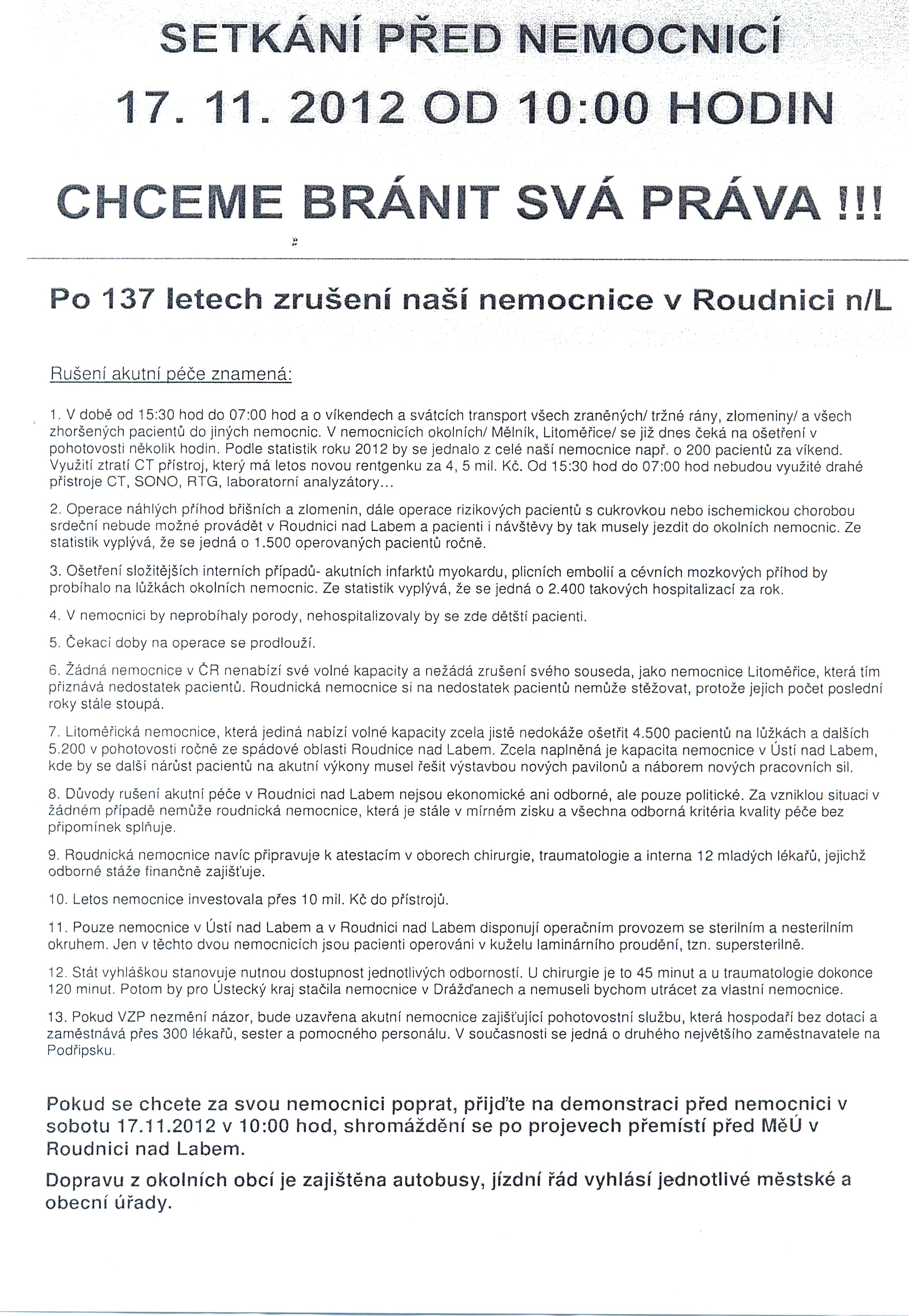 Podle informace Svazu zdravotních pojišťoven ČR by mělo dojít k „úplnému útlumu“ akutní lůžkové péče v roudnické nemocnici. Tento zásah do systému dostupnosti lékařské péče by se závažným způsobem dotkl nejen občanů města Roudnice nad Labem s jeho téměř 14 tisíci obyvateli, ale i celého regionu Podřipska, kde v dalších 33 obcích žije více než 30 tisíc lidí.