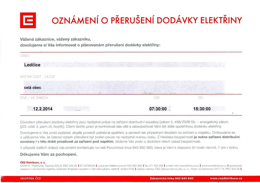 OZNÁMENÍ O PŘERUŠENÍ DODÁVKY ELEKTŘINY 12. 2. 2014 V CELÉ OBCI OD 7:30 DO 15:30 HODIN