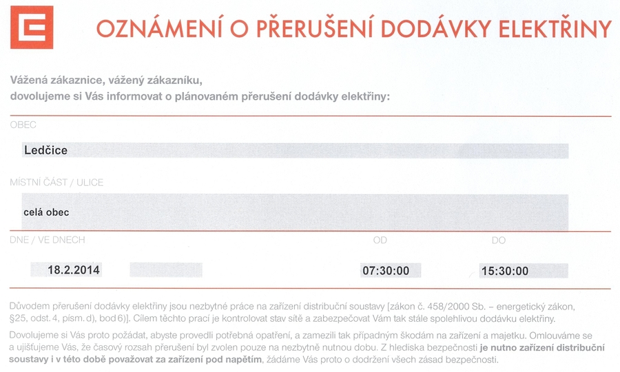 OZNÁMENÍ O PŘERUŠENÍ DODÁVKY ELEKTŘINY 18. 2. 2014 V CELÉ OBCI OD 7:30 DO 15:30 HODIN