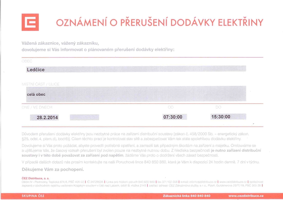 OZNÁMENÍ O PŘERUŠENÍ DODÁVKY ELEKTŘINY 28. 2. 2014 V CELÉ OBCI OD 7:30 DO 15:30 HODIN