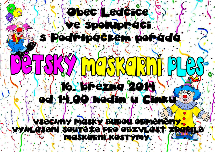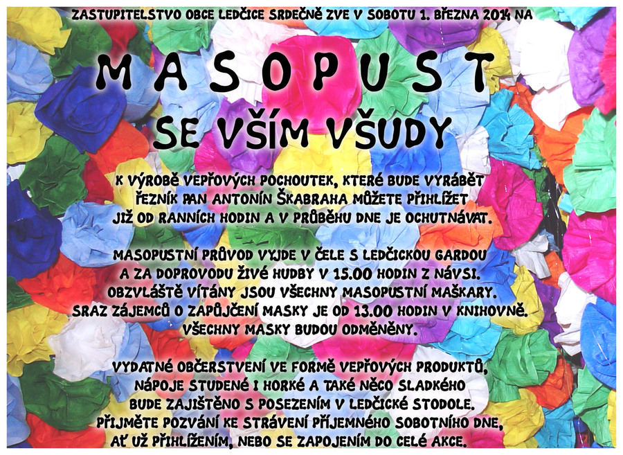 Zastupitelstvo obce Ledčice srdečně zve v sobotu 1. 3. 2014 na MASOPUST SE VŠÍM VŠUDY.