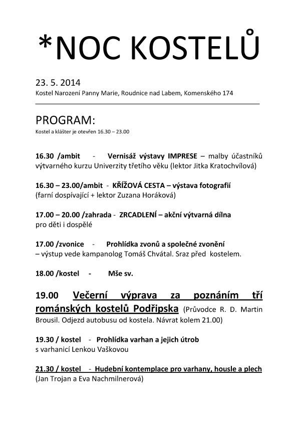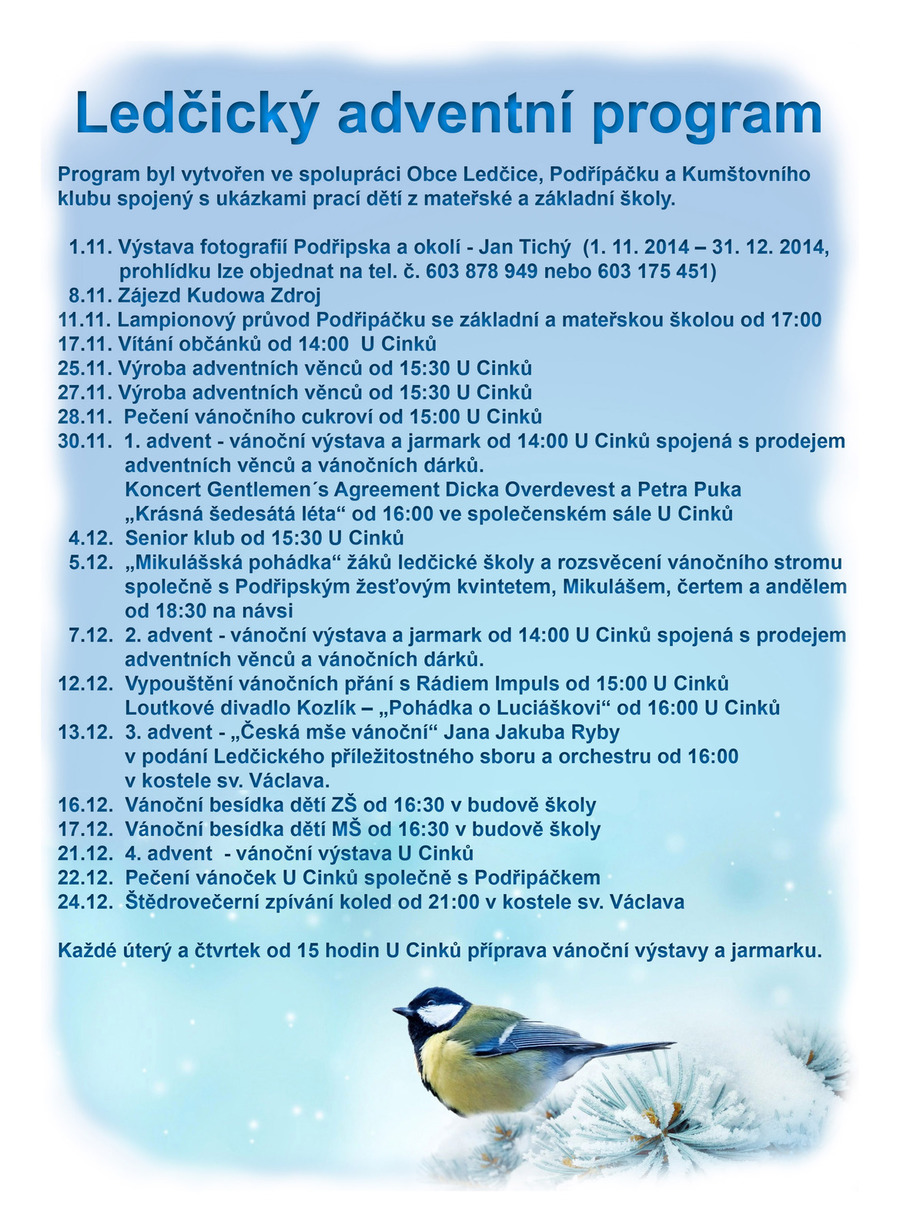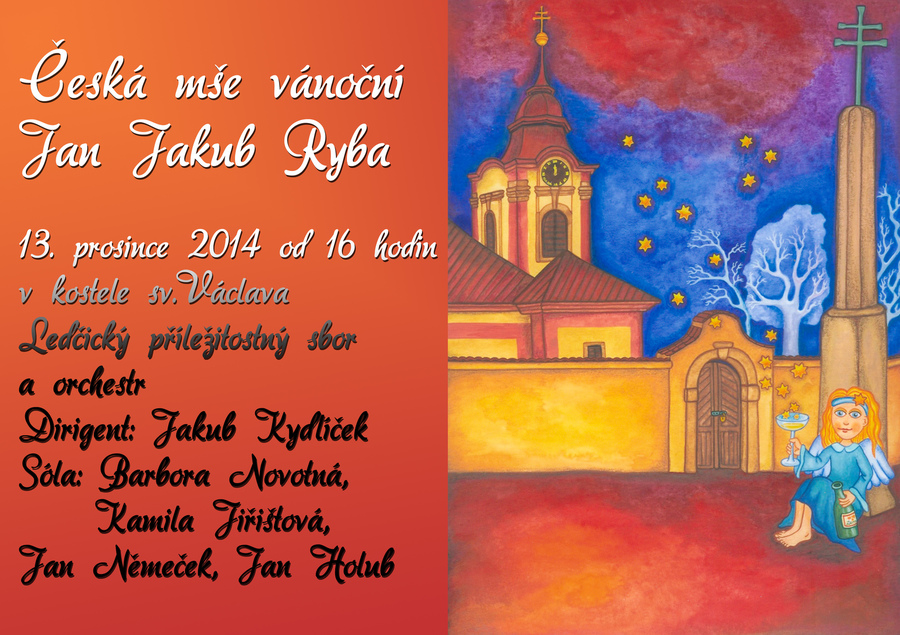Srdečně zveme na Českou mši vánoční Jana Jakuba Ryby dne 13. prosince 2014 od 16 hodin v kostele sv.Václava. Účinkuje Ledčický příležitostný sbor a orchestr, diriguje Jakub Kydlíček, sóla Barbora Novotná, Kamila Jiřištová, Jan Němeček a Jan Holub.