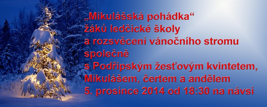 „Mikulášská pohádka“ žáků ledčické školy a rozsvěcení vánočního stromu společně s Podřipským žesťovým kvintetem, Mikulášem, čertem a andělem 5. 12. 2014 od 18:30 na návsi