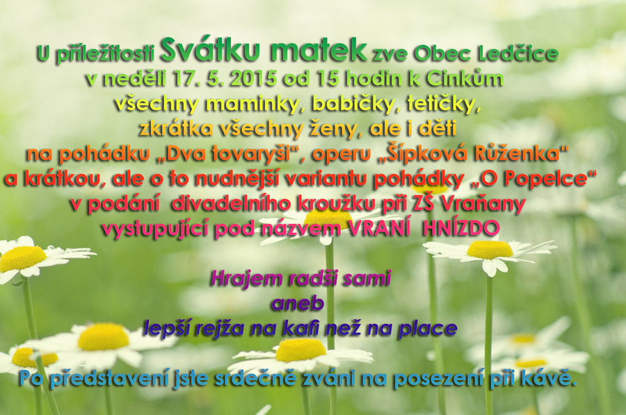 Ustavující schůzka Ledčického ochotnického divadelního spolku se bude konat ve čtvrtek 5. 3 .2015 v 18:30 hod