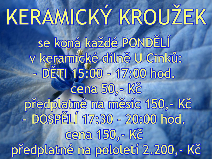 Kurz 10 lekcí, cena za materiál celkem 150,- , cena za 1 hodinu 50,-, místo Společenské centrum U Cinků.