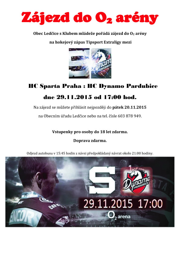 Obec Ledčice s Klubem mládeže pořádá zájezd do O2 arény na hokejový zápas Tipsport Extraligy mezi HC Sparta Praha : HC Dynamo Pardubice dne 29.11.2015 od 17:00 hod.
