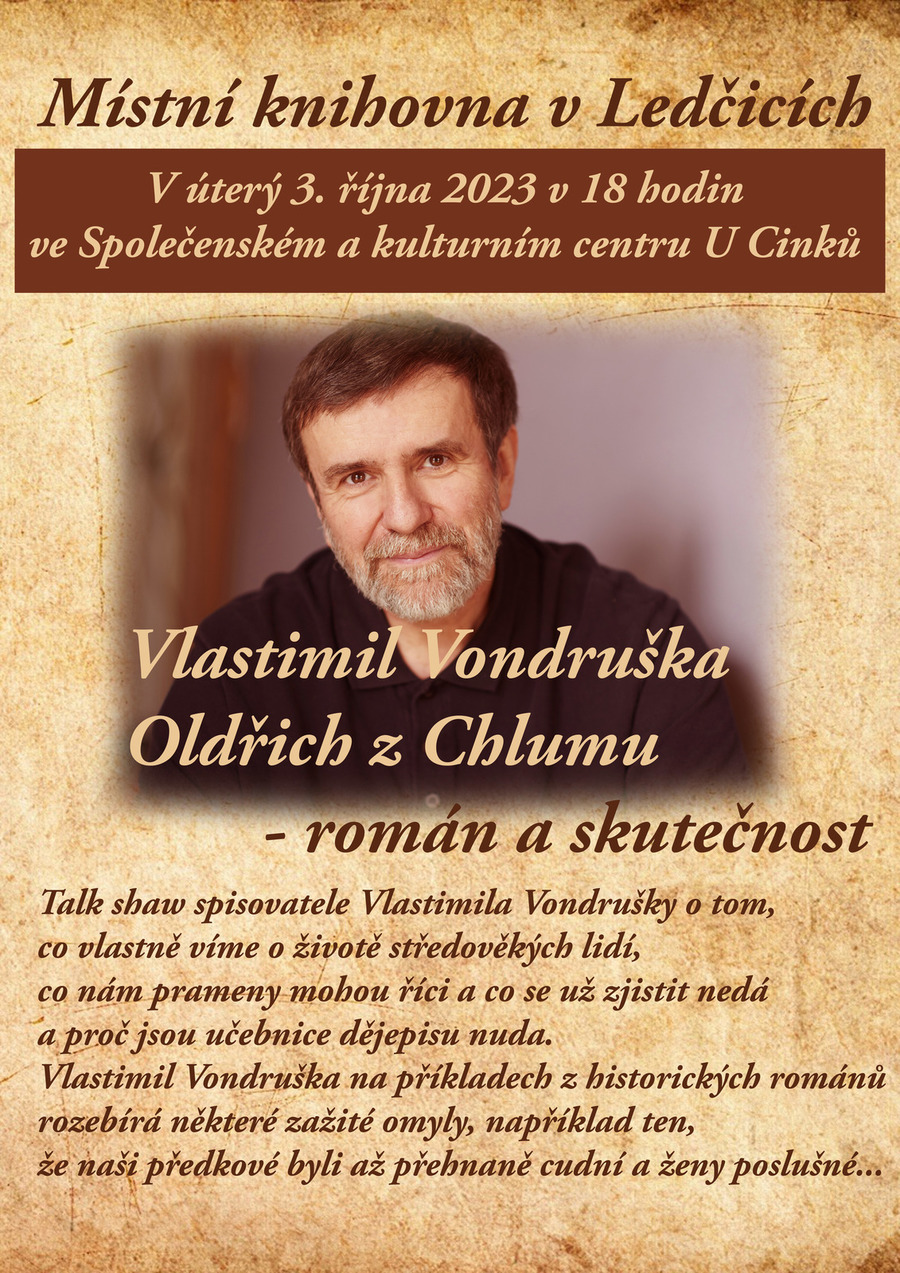 Úvod > Obec > Aktuality > Beseda s Vlastimilem Vondruškou - v Místní knihovně v Ledčicích 3. 10. 2023