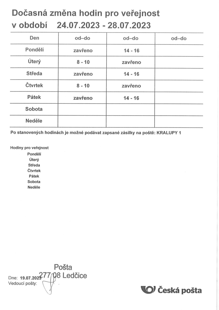 Úvod > Obec > Aktuality > Česká pošta-dočasná změna hodin pro veřejnost 24.7.-28.7.2023