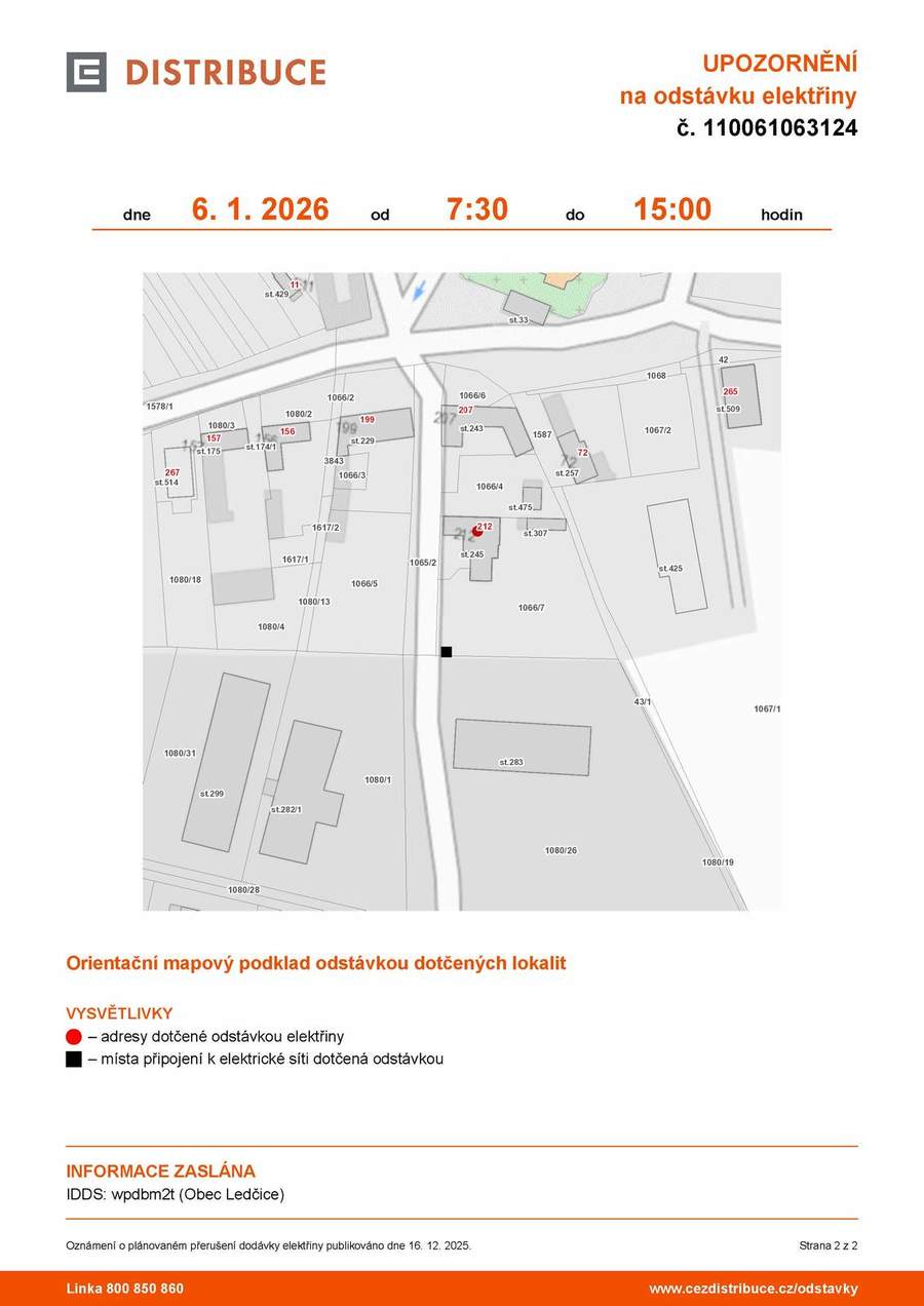 Úvod > Obec > Aktuality > ČEZ-upozornění na odstávku elektřiny 6.1.2025 Ledčice č.p.212