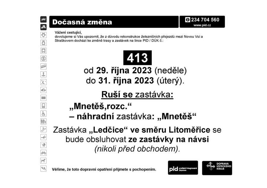 Dočasná změna jízdních řádů linky 413 od 29. října do 31. října 2023 z důvodu rekonstrukce železničních přejezdů mezi Novou Vsí a Straškovem na silnici č. 608.