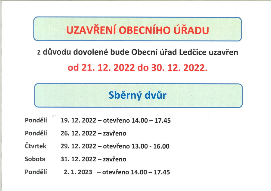 Úvod > Obec > Aktuality > Obecní úřad Ledčice - uzavření z důvodu dovolené
