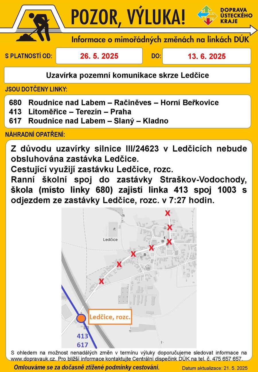 Informace o výluce linky 680 v termínu od 26. 5. 2025 do 13. 6. 2025 z důvodu uzavírky pozemní komunikace III/24623 v obci Ledčice: