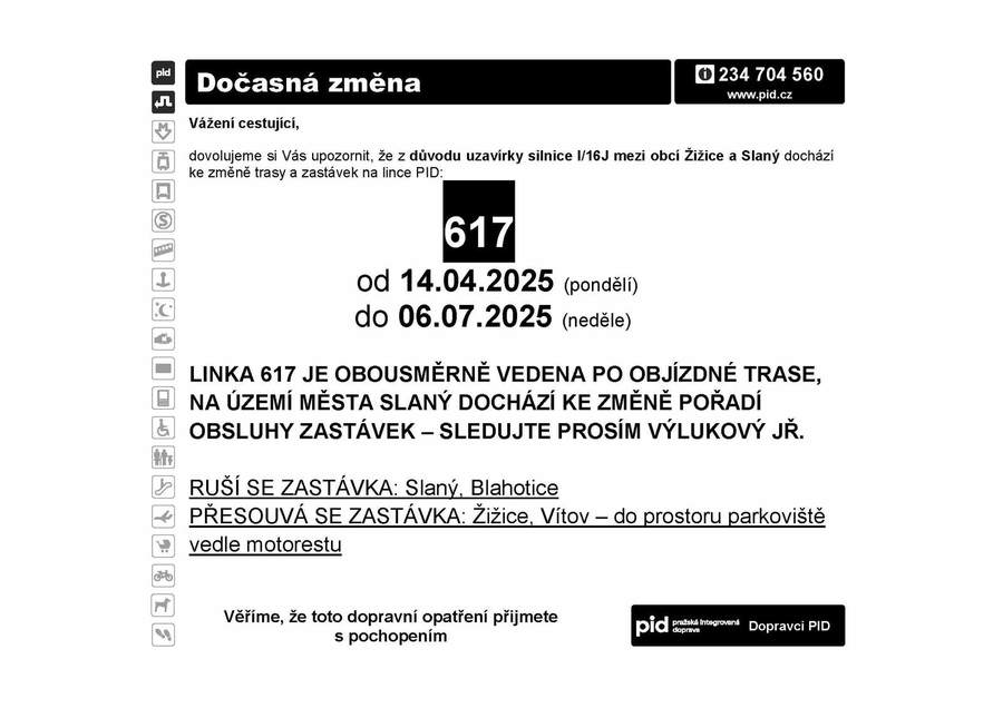 Z důvodu uzavírky silnice I/16J v úseku Slaný – Žižice od 14. 04. 2025 do 06. 07. 2025 bude na lince 617 platit výlukový jízdní řád.