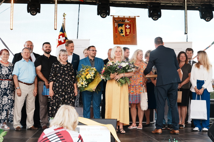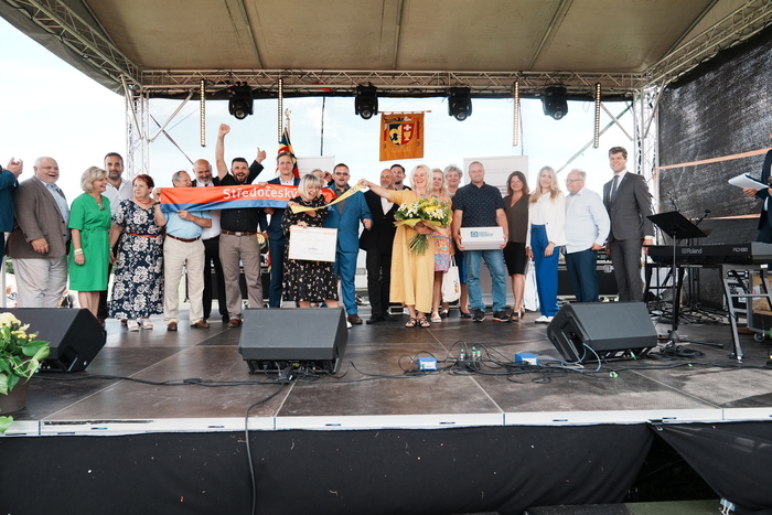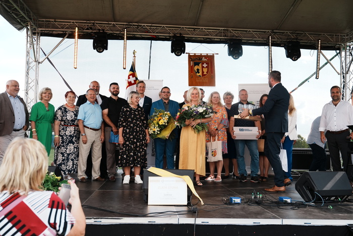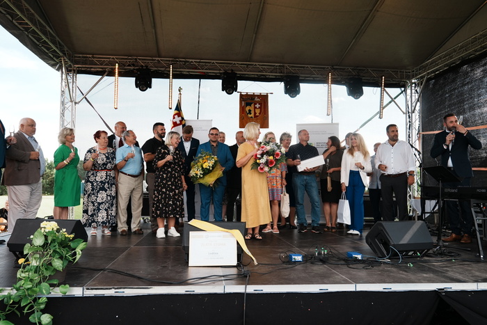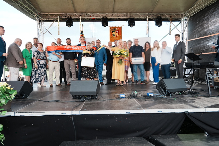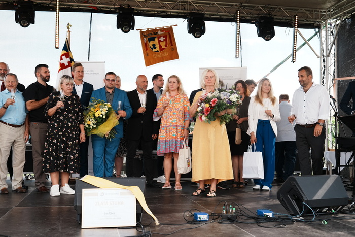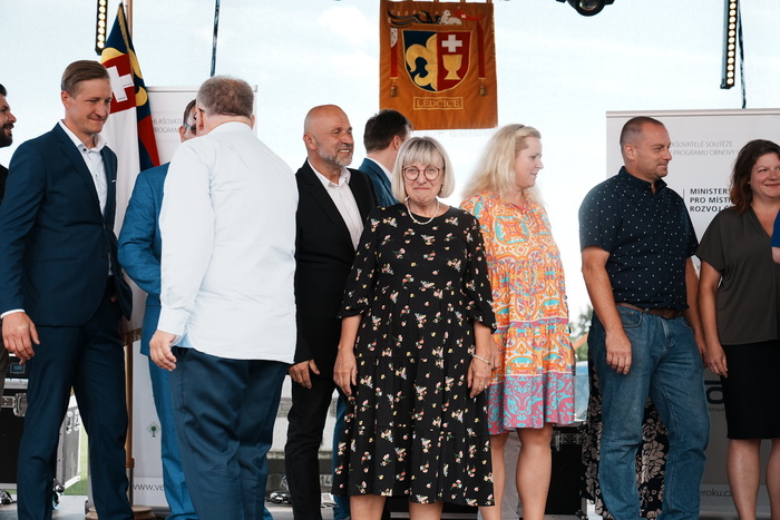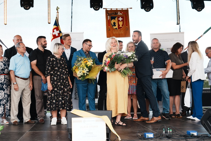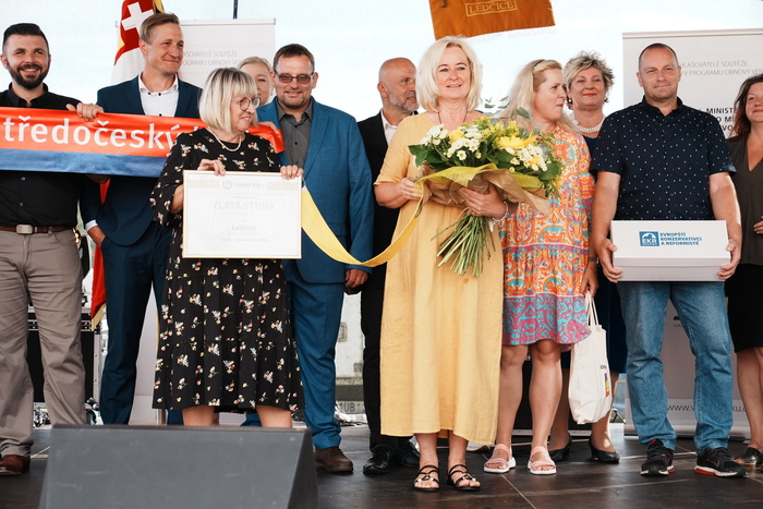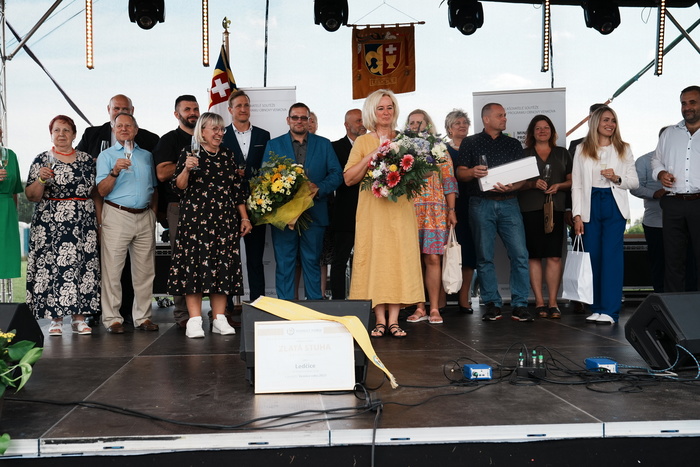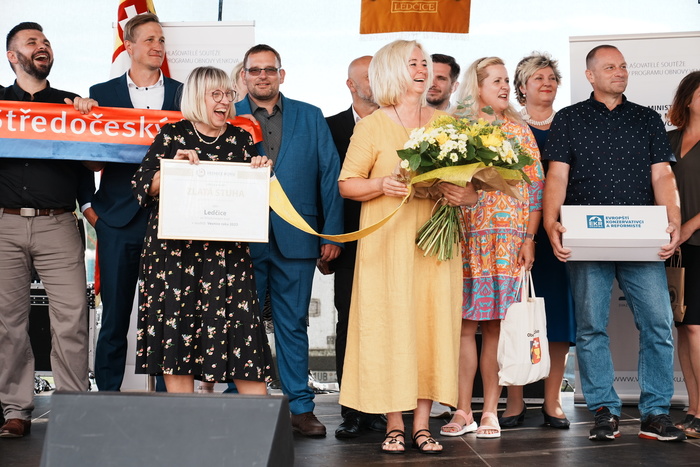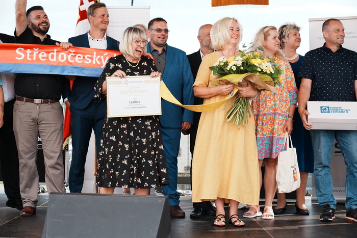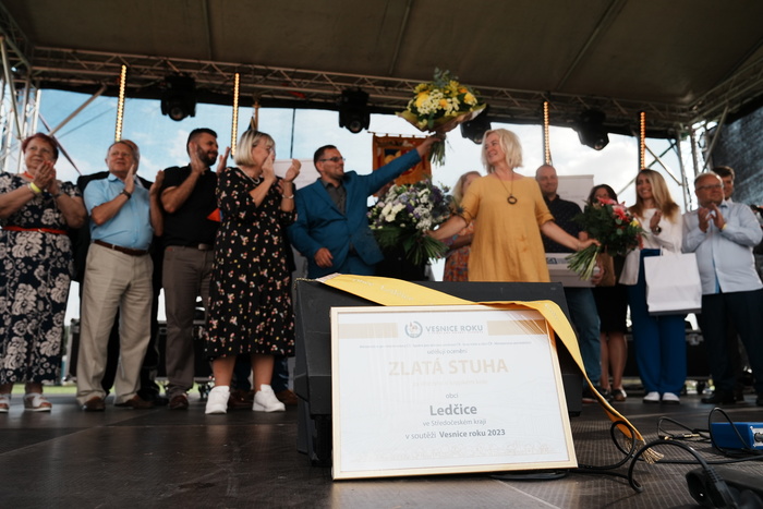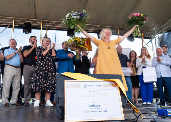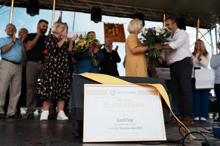 Vyvrcholením celého dne bylo předání Zlaté stuhy z rukou náměstka hejtmanky Středočeského kraje pro oblast regionálního rozvoje a územního plánování pana Jiřího Snížka a náměstka ministra pro místní rozvoj pana Lukáše Černohorského obci Ledčice! Zlatá stuha je ocenění kolektivní práce všech zastupitelů naší obce, a proto jsme si pro cenu na podium za podpory fandících ledčičáků a příznivců Ledčic vystoupali společně. Úspěch jsme oslavili skleničkou šampaňského. KH