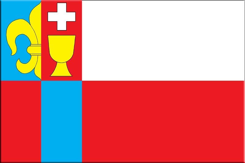 PRAPOR: List tvoří modro-červený žerďový pruh široký jednu třetinu délky listu a dva vodorovné pruhy, bílý a červený. V horním žerďovém modrém poli půl žluté lilie přiléhající k hornímu červenému poli s bílým řeckým křížem nad žlutým kalichem. Poměr šířky k délce listu je 2 : 3.